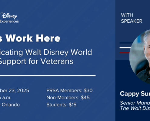 Join PRSA Orlando as U.S. Navy veteran and Disney Communications leader Cappy Surette shares how Disney has honored service members, veterans and their families both within the company and in the community for more than century.