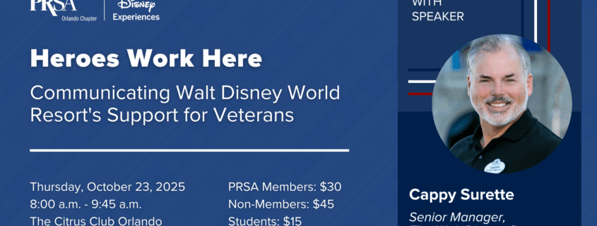 Join PRSA Orlando as U.S. Navy veteran and Disney Communications leader Cappy Surette shares how Disney has honored service members, veterans and their families both within the company and in the community for more than century.